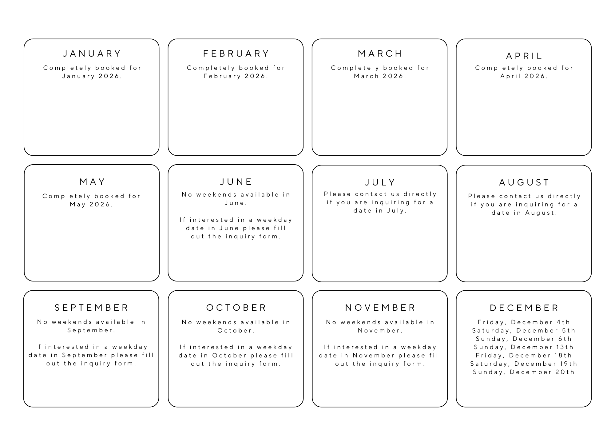 Our 2026 dates are filling up quickly! If you are interested in a weekday or weekend date, please fill out the inquiry form using the button below.